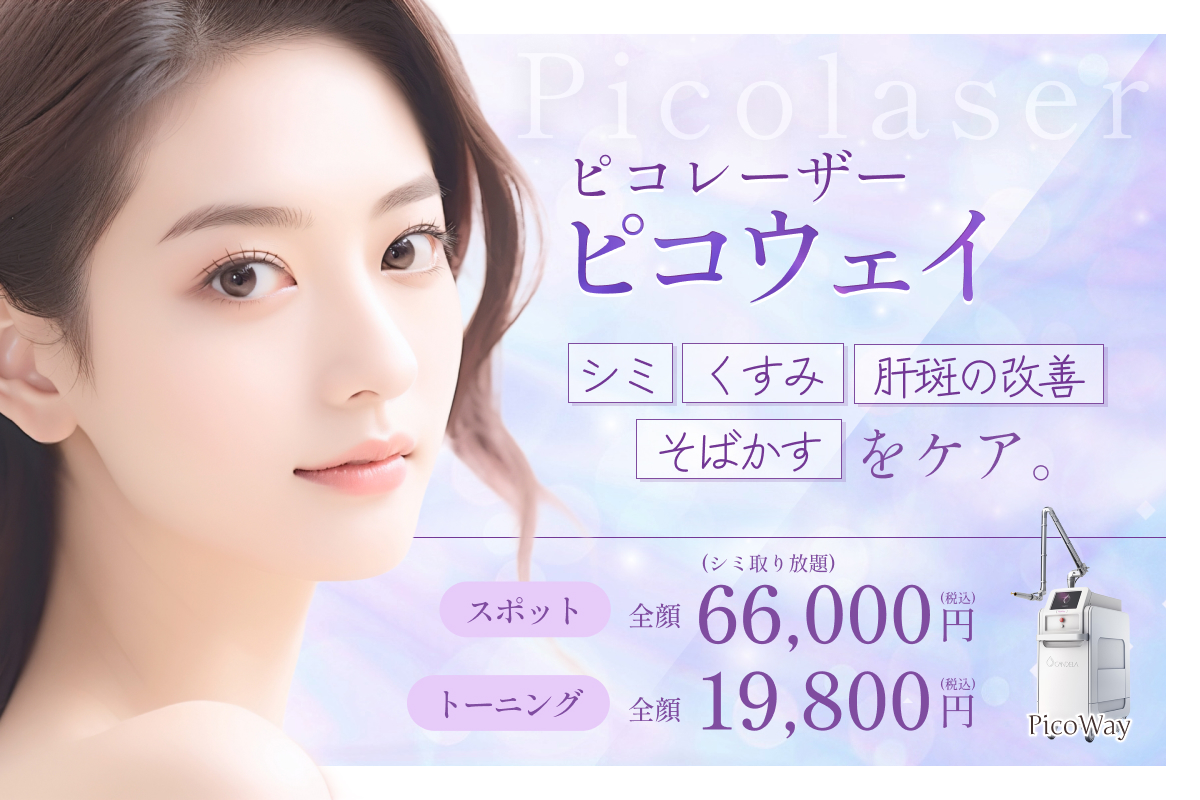 | 治療概要 | ピコレーザーを点状に照射し、肌の内側に微細な刺激を与えることで、コラーゲン生成。皮膚への負担を抑えながら、シミ・そばかす・くすみの改善と肌質・ハリ感の向上を目指します。 |